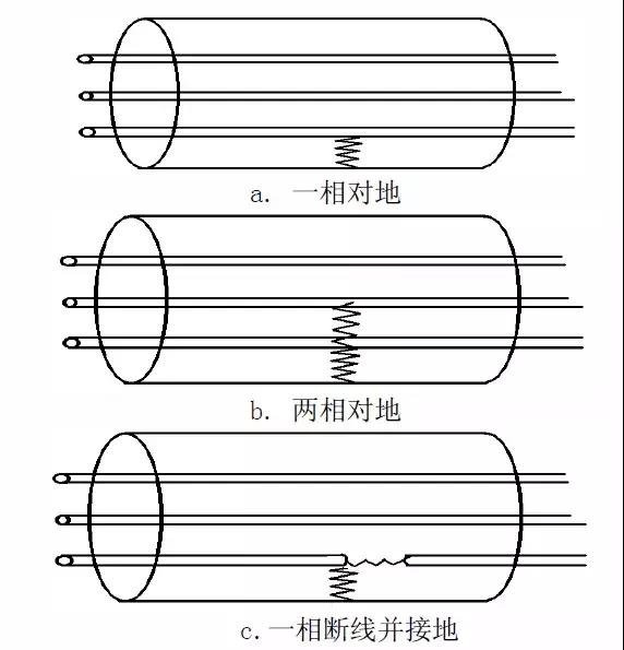 電纜故障從型式上可分為串聯(lián)與并聯(lián)故障。串聯(lián)故障指電纜一個(gè)或多個(gè)導(dǎo)體(包括鉛、鋁外皮)斷開;通常在電纜至少一個(gè)導(dǎo)體斷路之前,串聯(lián)故障是不容易發(fā)現(xiàn)的。并聯(lián)故障是導(dǎo)體對(duì)外皮或?qū)w之間的絕緣下降,不能承受正常運(yùn)行電壓。實(shí)際的故障型式組合是很多的,圖1給出了可能性較大的幾種故障形式。例如:圖1.c所示,導(dǎo)體斷路往往是