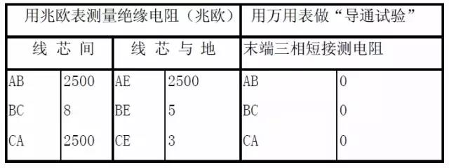 測(cè)量絕緣電阻時(shí),使用兆歐表(1千伏以下的電纜,用1000伏的兆歐表;1千伏以上的電纜,用2500伏的兆歐表)來測(cè)量電纜線芯之間和線芯對(duì)地的絕緣電阻;進(jìn)行“導(dǎo)通試驗(yàn)”時(shí),將電纜的末端三相短接,用萬用表在電纜的首端測(cè)量芯線之間的電阻。現(xiàn)將一故障電纜的測(cè)量結(jié)果列于表2中,供參考。